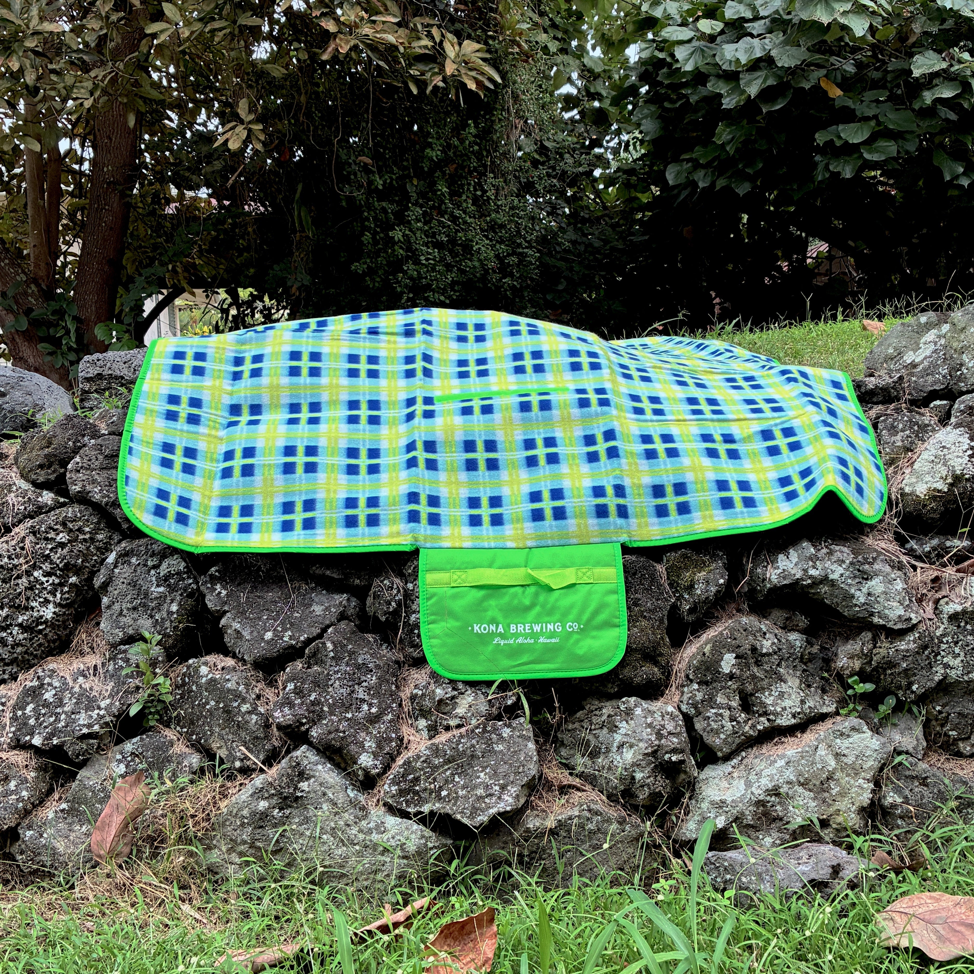 The comfort side features a soft 75% fleece and 25% polyester blend with a bright plaid pattern, while the sturdy 100% polyester bottom keeps you dry and comfortable wherever you spread out. A Kona Brewing Hawaii logo closure makes it easy to roll up, secure, and pack away. Perfect for relaxed days at the park or at the beach.